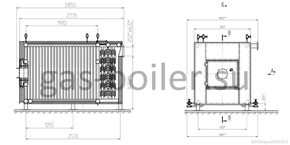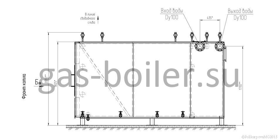 Котел 1,1 МВт газовый гладкотрубный, движение теплоносителя происходит в сварной трубной системе, состоящей из коллекторов и вваренных в них труб топочных и конвективных панелей. Снаружи котел имеет каркас с установленной на нем теплоизоляцией и обшитый стальными листами. Взрывной клапан находится сзади котла.