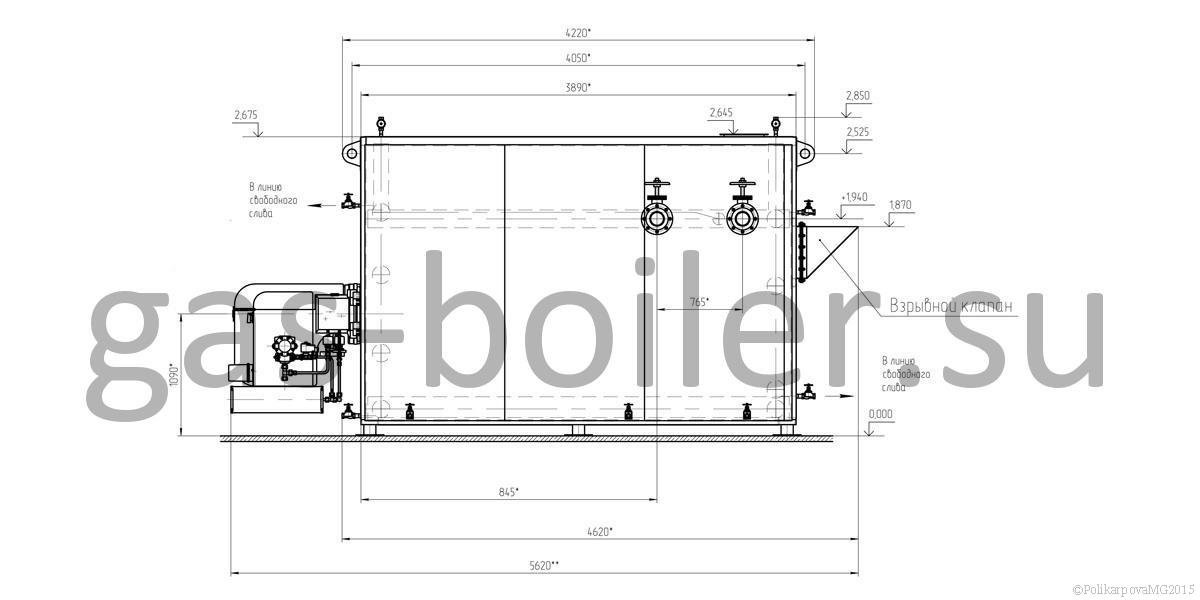 Котел 2 МВт газовый гладкотрубный, движение теплоносителя происходит в сварной трубной системе, состоящей из коллекторов и вваренных в них труб топочных и конвективных панелей. Снаружи котел имеет каркас с установленной на нем теплоизоляцией и обшитый стальными листами. Взрывной клапан находится сзади котла.